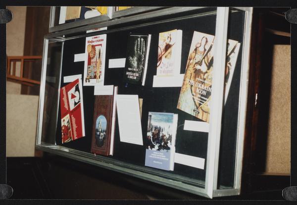 Library exhibit display case with international publications