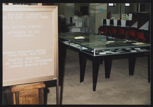 Watson Library exhibit area with display cases and informational signage