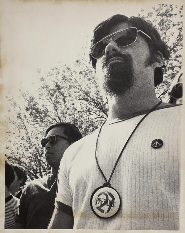 Man Wearing Sunglasses and a Peace Sign Pin
