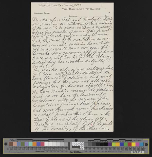 [8] (1 of 3) "Miss Watson to the class of 1890, The University of Kansas" [handwritten 3-page speech]/ newspaper clippings: 4-10-1897 Kansas Universit...