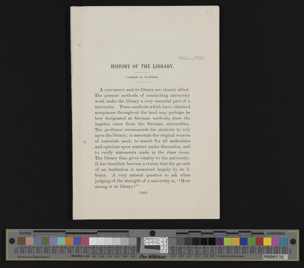 [17] (4 of 17) 16 page booklet: "History of the Library," by Carrie Watson, 1866-1891 / Vol.VU, No. 15 edition of University Courier (1894), 2 pages