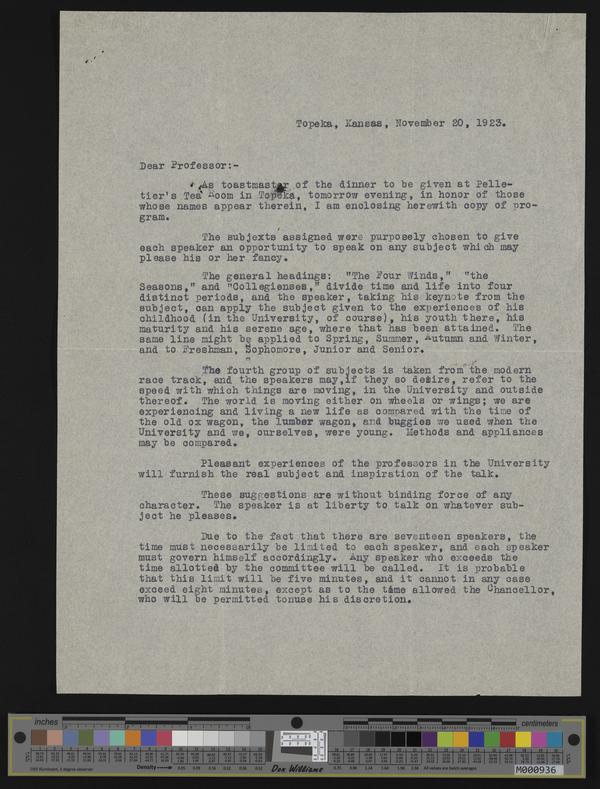 [38] (1 of 2) 11-12-1923 2-page letter from Thomas Doran. to faculty invited to alumni banquet