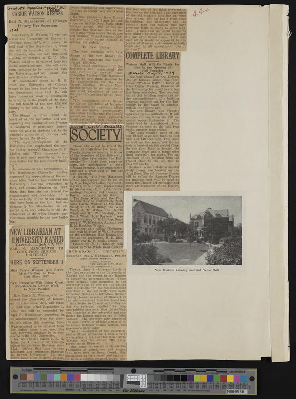 [44] Newspaper clippings: 1921 Graduate Magazine Special News edition, "Carrie Watson Resigns"/ 7-27-1921 Journal World, "New Librarian at University ...
