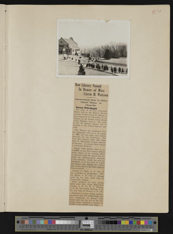 [51] Photograph: Spooner Library exterior showing horse and wagon, early vintage car, and pedestrian traffic:/ Newspaper clipping: 6-13-1924 Kansan, "...