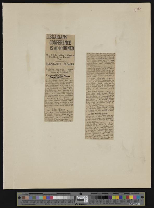 [59] Newspaper clipping: 11-6-1926 Parsons Daily Republican, "Librarians' Conference is Adjourned"