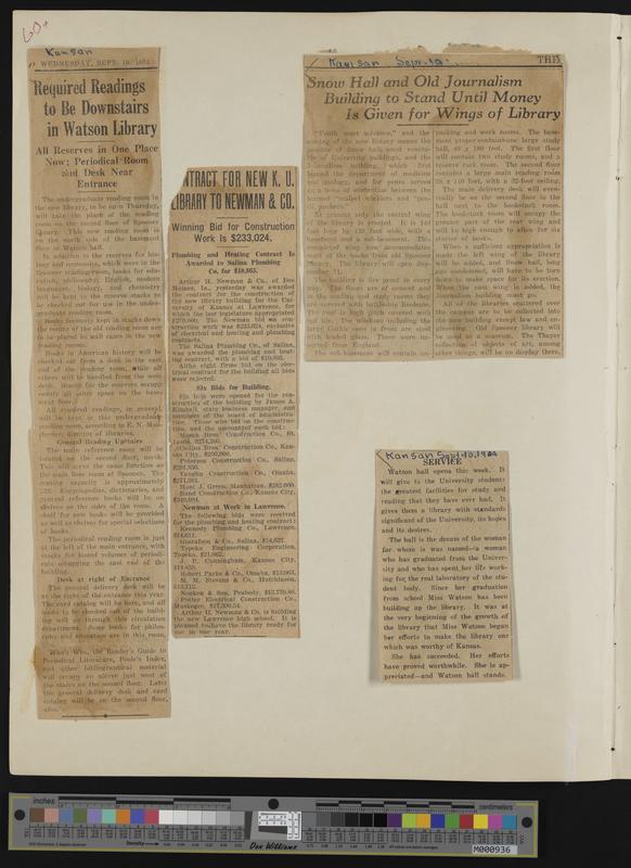 [60] Newspaper clippings: "Contract for New KU Library to Newman & Co."; 9-10-1924 Kansan, "Snow Hall and Old Journalism Building to Stand Until Money...