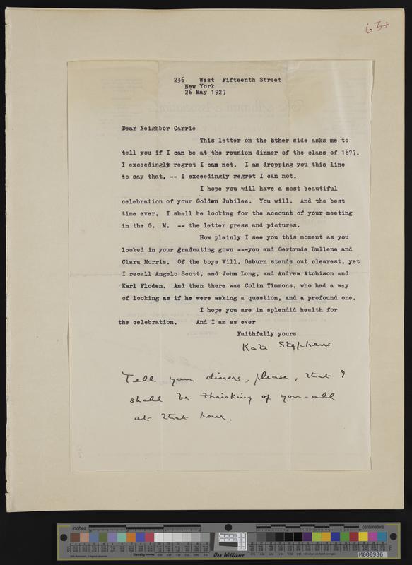 [63] (2 of 2) 5-24-1927 letter from Fred Ellsworth to Kate Stephens re: 1927 reunion of 1877 KU graduating class with letter of regret from Kate Steph...