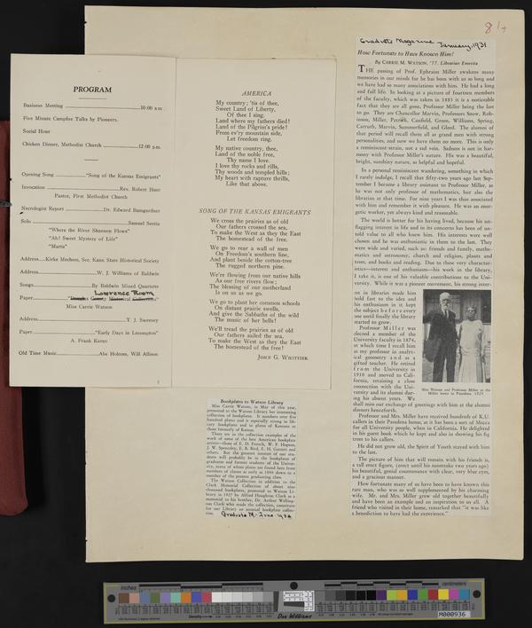 [81] (2 of 2) 9-14-1933 program of the Douglas County Old Settlers Association meeting, Lawrence, KS/ Photo clipping from Graduate Magazine: January 1...