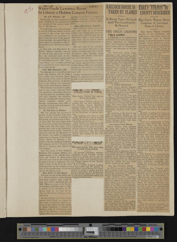 [95] Newspaper clippings: 11-7-1937 Kansan, "Writer Finds 'Lawrence Room' in Library a Hidden Campus Feature"; 4-1-1938 Journal World, "Collection is ...
