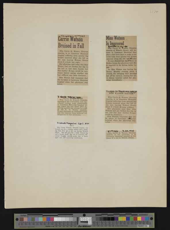 [111] 6 newspaper clippings: 2-27-1948 Kansan, "Carrie Watson Bruised in Fall"; 2-28-1940 Journal World, "Suffers Bruises in Fall"; April 1940 Graduat...