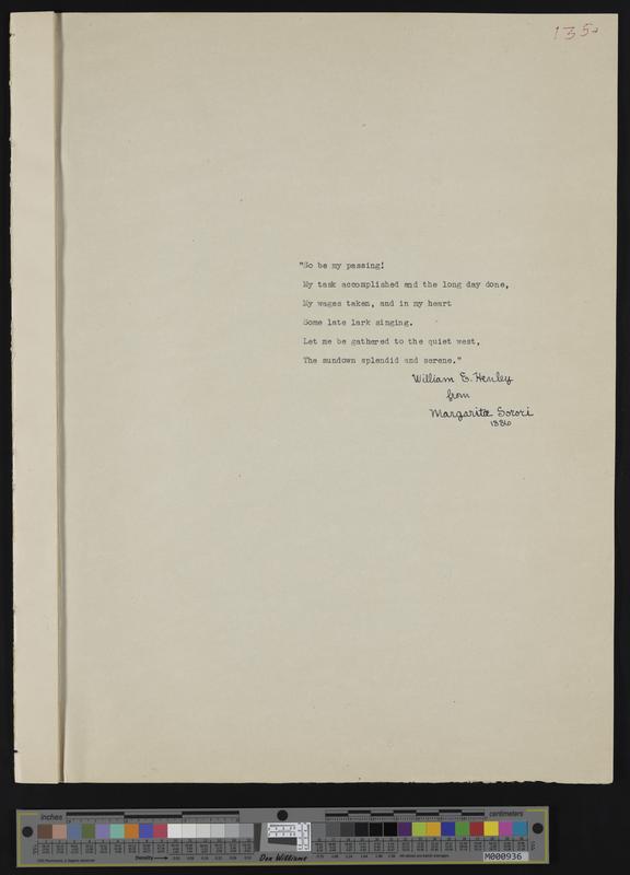[135] Poetic lines typed onto scrapbook page ("William E. Henley from Margarita Sorori, 1886")