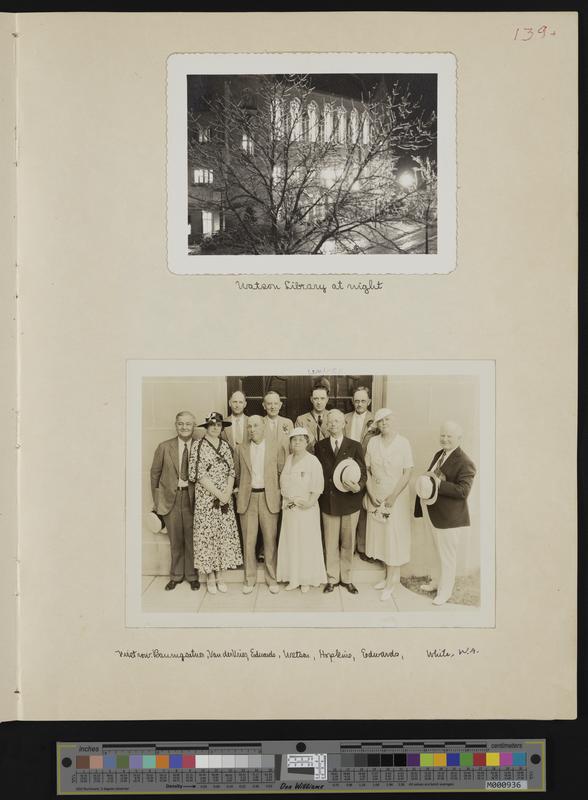 [139] 2 photographs: exterior of Watson Library at night and group photo of KU senior alumni: Baumgartner, Van derVries, Edwards, Watson, Hopkins, Edw...