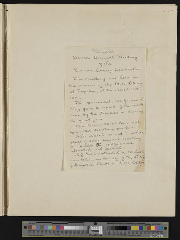[153] (1 of 3) 3-page handwritten minutes by Carrie Watson of the second annual meeting of the Kansas Library Association (differs from typed minutes ...