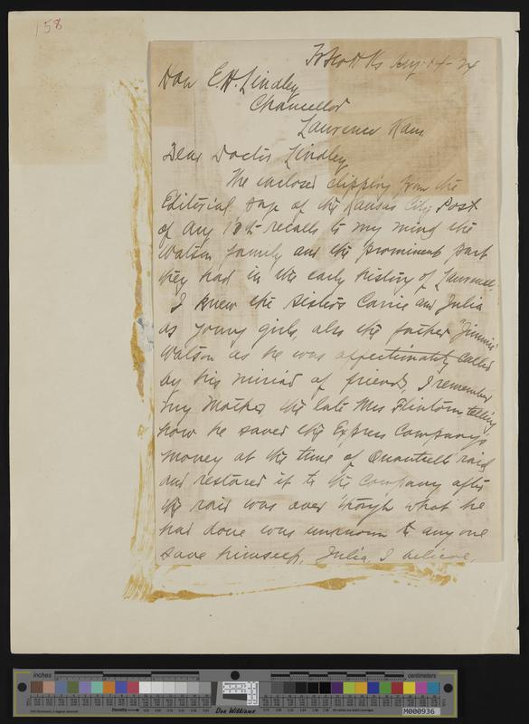 [158] Page one of 8-14-1924 handwritten letter from Edward E. Dix to E.H. Lindley re: naming of Watson Library and recollections of Quantrill' s Raid