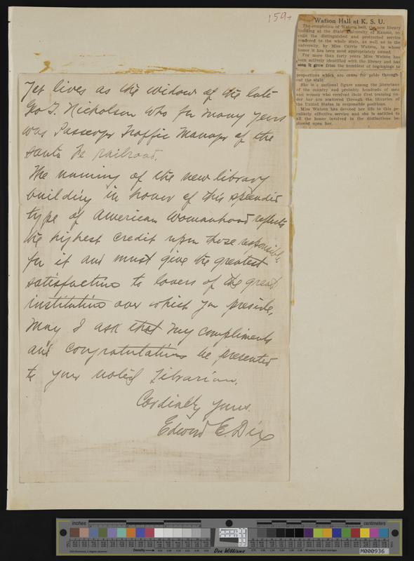 [159] Page two of8-14-1924 letter (continued from p. 158) / and letter's enclosed newspaper clipping: "Watson Hall at K.S.U." [from Kansas City Post]