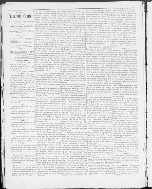 WANTED—A Medical Department -- The Local Oratorical Contest Should Be Held Before the Holidays -- The Prospect for Next Year Is That the Reins of Discipline Will Be Drawn Tighter Than Ever -- There Is No Question but That the University Can Get and Ought to Have a Military Instructor -- The Time Is Soon at Hand When the Students Will Gather in and Go to Work at Their Studies, Managing Elections and Dodgin... -- It Will Not Be Long Before There Will Be a Medical College Some Place Else in Kansas if Such a Department Is Not Soon Ad... -- We Wonder if the Professors Will Get Off That Old Joke of a Friday Morning Roll Call -- If So, Wouldn't It Be a Good Idea to Mark the Attendance of the Professors? -- MOTTO.—Fraternity Rule Must Be Broken. -- The City of Lawrence Annually Receives From Students Attending the University, $150,000 -- What Are the Necessities of a College Paper? -- To the Business Men of the City of Lawrence, Who Yet Have Bills Unpaid on the Athletic Association, We Have to Say Again... -- Our Readers Will Be Pleased to Learn That There Will Be Opened This Autumn a Worthy Rival and Successor to the Magnifice... -- Such Knowledge Becomes the Basis of Enterprise, the Forerunner of the Institution of New Lines of Traffic and Exchange..... -- To Realize the Full Fruits of the Work Inaugurated by the World's Exposition... -- The New Company Begins Its Work Under the Most Favorable Auspices; With a Property Complete for Exposition Purposes Orig... -- Railroad Fares Will Be Arranged on the Basis of Not to Exceed One Cent Per Mile From Any Point... -- The Courier Would Like to Repeat the Remark That the Literary Societies Would Do Much Better Work if Occasionally Recogn... -- There Ought to Be a Boarding Hall in Connection With the University -- We Should Not Always Be Left to the Tender Mercies of the Town People -- Board Is Getting Higher and Worse Every Year -- Circulation 1,000. LAWRENCE, KAS., Aug. 1 -- To Whom It May Concern: For the Six Months Past the Regular Issue of the WEEKLY COURIER Has Been 1,000 Copies. -- Four Months Ago We Published the Above With the Claim of the Largest Circulation of Any College Paper in the United Stat... -- In This Time the Highest Certified List We Received From Nearly One Hundred Exchanges Was 900. -- Until Further Notice We Will Now in Large Type Attest THE LARGEST COLLEGE JOURNAL CIRCULATION IN THE UNITED STATES. -- Entered at the Post Office at Lawrence, Kansas, as Second Class Matter. -- Cutler & Petroleum Engine Print. -- H. A. CUTLER, Publisher. -- J. SULLIVAN, President. F.T. OAKLEY, Sec'y. -- Editorial Staff. -- Business Managers. -- WANTED—A Medical Department. -- Our Law Department Is the Equal of Any in the West. -- Washington University Has Enlarged—500 Miles. -- The Law Department Promises Good Attendance the Coming Year. -- The Local Oratorical Contest Should Be Held Before the Holidays. -- The Prospect for Next Year Is That the Reins of Discipline Will Be Drawn Tighter Than Ever. -- There Is No Question but That the University Can Get and Ought to Have a Military Instructor. -- The Time Is Soon at Hand When the Students Will Gather in and Go to Work at Their Studies, Managing Elections and Dodgin... -- It Will Not Be Long Before There Will Be a Medical College Some Place Else in Kansas if Such a Department Is Not Soon Ad... -- We Wonder if the Professors Will Get Off That Old Joke of a Friday Morning Roll Call. -- If So, Wouldn't It Be a Good Idea to Mark the Attendance of the Professors? -- We Hope Every Student Before Returning to K. S. U. For the Coming Year Will Make Arrangements With His or Her Local Pape... -- The City of Lawrence Annually Receives From Students Attending the University, $150,000 -- Annual Attendance, Exceeding 500; Average Expense in Actual Cash Spent, at a Low Estimate Being $300. -- Every Year Hundreds of People Visit the City During Commencement Week, Etc., Because of Its Being the Location of the St... -- Yet Notwithstanding the State Has Spent All the Money Necessary for Such an Institution at This Place, the City Has Neve... -- Through the Generosity of That Staunch and Patriotic Old Friend of the University, Gov. Robinson, the City Now Has an Op... -- Avenue, in Expense to the City, Only Requires Grading. Few Cities in the State but What Would Give Many Times This in Ad... -- The City of Lawrence Owes This Approach to the University Grounds. An Opportunity Is Now Given Which Perhaps Will Never... -- It Is a Common Experience With Students Who Are Questioned in Regard to the University by Those Who Contemplate Sending... -- There Seems to Be More Anxiety on This Point Than Any Other, and the Opinion Appears to Be Current That Lawrence and The... -- As Long as We Have Been Connected With the University, We Have Seen Nothing to Indicate a Character of This Kind, and If... -- It Is Unfortunate That a Few Such Imbecilated Minds Go Out From Our Institution; But if You Will Take the Trouble to Inv... -- While the State College Has No Connection With the Church, the Teachings of Every Professor Are Those of an Honest, Fait... -- In Regard to the City, Certainly a More Moral One Cannot Be Found in the State. With a Church on Every Corner, Absolute... -- And Yet, After All, It Depends a Great Deal Upon the Boy Himself. It Is a Test Which Must Come to Every Young Man Sooner... -- If Your Boy Has Lived Uprightly at Home, You Can Depend Upon It He Will Remain So at the Kansas University. -- What Are the Necessities of a College Paper? -- Every Student Can Give a Prompt Answer and Tell Exactly How a College Journal Ought to Be Managed. He Has Frequently Exp... -- The Local Editor Should Be Different. He Is to Be the Wide-Awake, Get-Up-and-Dust Young Man of the University. He Must A... -- The Business Manager Comes Last. He Should Be a Very Nice Man, One Everybody Likes. He Should Always Be Ready for a Figh... -- To the Business Men of the City of Lawrence, Who Yet Have Bills Unpaid on the Athletic Associa