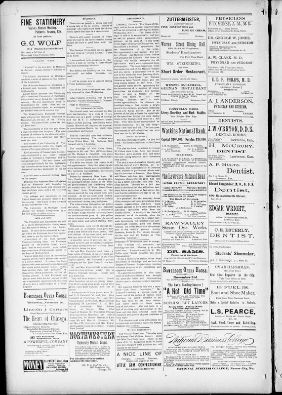 Football Is the New Daily at Minnes -- The Athletic Association at Michigan -- One of the New Features at Minnesota -- A Joint Debate Between the University of Wisconsin and University of California -- The Pennsylvania Freshman Football Team -- The Registration at Yale This Year -- The Trustees of the University of Vermont -- The University of Pennsylvania Has Recently Established -- Yale Will Erect a Statue of Nathan Hale -- Debaters Who Represent Harvard Against Yale or Princeton -- The Colleges and Universities in the United States Own Property Valued at $2,000,000,000 -- The University of Michigan Band Charges the Football Management $500 -- The Freshmen and Sophomores Are Still at It, and in Most Points the Victory Seems to Belong to the Sophomores -- In Spite of the Numerical Advantage Which the Freshmen Have Their Opponents Seem to Get the Better of Them -- A New Phase of the Fight Appeared Thursday Morning When the Freshmen Posted on the Bulletin Board a Caricature -- The Sophomores Bound to Represent a Row of Sophomores Bound to the Fence of McCook Field -- Most of Them Had a Look of Uttermost Anguish and the Whole Picture Was Worthy of a Senior Annual -- Of Course the Sophomores Who Were Gathered Around Resented This Action Which Seemed to Cast Reflections on Their Class -- They Promptly Endeavored to Obtain Possession of the Offending Picture -- But Not Enough to Offer Any Considerable Opposition and the Work of Art Is Now a Valued Trophy of a Sophomore Engineer -- They Will Be at Home to Their Friends After December 1st at 1021 Quincy Street -- The Bride's Going Away Gown Was an Olive Green, Tailor Made Costume, With Hat to Match -- Among the Out of Town Guests Were: John and D. S. Fairchild, Mr. And Mrs. John Fairchild of Overbrook, Mr. And Mrs. Elme... -- Professor Irving Merrifield and Wife of Kansas City, Dr. Homer Oatman of Lawrence, Mrs. C. P. Grovesnor and Mrs. Towne A... -- Mr. And Mrs. Fairchild Left on the Night Train for Two or Three Weeks' Trip to Denver, Colorado Springs, Pueblo and Salt... -- Mr. Laycock Followed This With a Report Upon "Late Trust Legislation" -- Laycock Is Making a Special Study of Trusts, and in His Review of Various State Trusts He Called Attention to the Fact T... -- And Many Made in Direct Imitation of Each Other -- Also That There Is a Lack of Anything New, and Original in the Laws, and That Their Influence Upon the Operation and Gro... -- The Program Next Week Will Contain Two Reports Upon Educational Topics by Messrs. Hannah and Gordon -- [advertisements] -- Another Big Success -- Elegant Special Scenery, Wonderful Mechanical Devices, Mysterious Electrical Effects, a Vivid Picture of the Great Fire -- SEE the Marvelous "Approaching Train." -- A Powerful Company -- Seat Sale at Clark Bros.' -- For Circulars of Information Address the Secretary -- DR. N. S. DAVIS, JR., 2431 Dearborn St., Chicago, Ill. -- BOWERSOCK OPERA HOUSE. Wednesday, November 1st. -- The Ray's Howling Success! "A Hot Old Time" -- Nothing but Laughs. -- Pretty Girls Catchy Music. -- This "Under the Gaslight" Musical Comedy Will Be Presented by the Following All Star Cast: -- John W. Jess, William McRobbie, John C. Leach, John Finney, John C. Hesson, Miss Ada Henry, Miss Pearl Revare, Miss Ada... -- And Miss Annie St. Tel. America's Greatest Novelty Dancer -- BOWERSOCK OPERA HOUSE. November 3rd. -- The Show That Has Made the Universe Laugh. -- Take Your Shoes to Him. -- NORTHWESTERN University Medical School. -- This School Has Been a Leader in Medical Education for Nearly Forty Years. -- It Invites Investigation of Its Laboratories, Equipment, Methods of Teaching, and the Character of Its Faculty. -- For Circulars of Information Address the Secretary -- DR. N. S. DAVIS, JR., 2431 Dearborn St., Chicago, Ill. -- National Business College, Kansas City, Mo. -- We Prepare Young People for Business Positions -- Regular Post-Graduate Courses in Shorthand, Typewriting, U. S. Civil Service, Bookkeeping, Telegraphy, Office Service, D... -- WE SUPPLY BUSINESS FIRMS WITH: Bookkeepers, Cashiers, Telegraphers and Other Office Assistants -- Over Two Hundred Business Firms Applied to Us Last Year for Office Help. -- NATIONAL BUSINESS COLLEGE, Kansas City, Mo.
