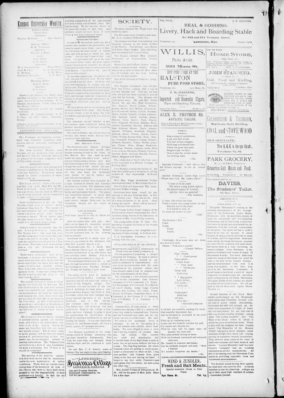 The Freshmen Are Beginning to Have Their First Delightful Experience With Quizzes, and Are Anxiously Awaiting the Result... -- The Mass Meeting Monday Noon Brought Out an Unusually Large Crowd and Showed That the Students This Year Are Going to Be... -- The Senior Annual Ought to Be a Success This Year, With Miss Hill and Mr. Buzzell at the Head -- The City Papers Have Been Paying Well Deserved Compliments to the Band, for Its Work Last Saturday -- The Senior Annual Ought to Be a Success This Year, With Miss Hill and Mr. Buzzell at the Head -- Such Entertainments as the One Last Tuesday Night Ought to Receive Better Patronage Than They Do -- The Entertainment and the Purpose for Which It Is Given Should Both Induce Everyone to Attend -- Already Basket-Ball Practice Has Begun -- The Varsity Had a Fast Team Last Year, and the Prospect Is Even Better This Year -- Class Teams Will Be the Rage for a Time Until the Material Is Developed for a Varsity Team -- The Basket-Ball Men Are Planning a Trip Into Nebraska for the Holidays -- There Was a Noticeable Lack of Enthusiasm at the Game Last Saturday -- The Council Did a Good Thing in Allowing the Glee Club a Trip This Year -- The Glee Club's Trips in the Past Have Always Been Very Successful and Under the Present Management, and With the Men Wh... -- A Glee Club Should Be as Much to a University as Its Athletic or Debating Teams and We Are Going to Have One This Year W... -- The Lawrence Journal Makes Charges of Professionalism Against Our Football Team, and Refers to the Unbecoming Conduct Of... -- The Journal Ought to Speak Plainly, and Say Who It Is That It Accuses of Professionalism, So That the Matter May Be Inve... -- The Weekly Does Not Believe That There Is Any Foundation for Such a Statement, but if There Is It Should Be Examined -- The Meeting of the Athletic Association Under the New Constitution Is Rather Cumbersome -- There Were No Reports Ready Except That of the Treasurer, and None of the Officers Who Were to Have Made Them Seemed To... -- Mrs. Marvin's Death -- The University and Friends of Dean Marvin Were Surprised and Pained Last Sunday Morning to Hear of the Death of Mrs. Mar... -- She Had Been in Poor Health for Years, but Only a Week Before Had Her Illness Taken a Serious Turn -- She Had Lived Among Us for Twenty Years, and Had Endeared Herself to the State of Her Health Had Prevented Her Having A... -- The Few Who Knew Her Intimately Were Bound to Her by Tender Ties and Will Miss Her Greatly -- Her Funeral Services Were Attended by a Large Number of Friends, Last Tuesday Afternoon at 4 O'Clock -- The Interment Took Place at 4 O'clock, in the Presence of the Family and Her Nearest Friends -- The Grave Was Beautifully Trimmed in Green and White, and the Casket Was Covered With Roses, Several Designs Being Sent... -- The State of Kansas Has Always Been in the Lead, and There's Where Kansas University Is Right With Her -- The Museums Are Not Inferior to Any and Contain Many Collections Which the Greatest Universities in the Land Would Be Pr... -- Our Library of 30,000 Books Is Not So Large, but With the Annual Appropriation of $5,000 It Is Increasing -- We Have Grown and We Are Growing and We Keep Abreast of the Times -- Our Library of 30,000 Books Is Not So Large, but With the Annual Appropriation of $5,000 It Is Increasing -- The Widow of Col. John B. Anderson Has Received From Andrew Carnegie the Assurance That He Will Build and Endow a Librar... -- Col. Anderson, Who Was the Uncle of the Late John A. Anderson, for Many Years a Congressman From Kansas, and at That Tim... -- Anderson Had a Fine Library, and Carnegie Used It to Advantage -- The Library That Col. Anderson Had Was Given at His Death to the College at Emporia, and Now Carnegie Is Going to Show H... -- It Is a Very Handsome Building and Kansas People Will Have a Better Opinion of Carnegie Hereafter -- Roy Rodgers, a Graduate of the Engineering School of Kansas University, Who Has Been Located at Schenectady, New York, F... -- Dr. And Mrs. C. E. Estery Went to Kansas City Last Night to Stay Until Sunday -- The Betas Initiated Mr. Frank Pratt Last Saturday Night -- The Phi Gammas Have Pledged a New Man, Mr. A. J. Lindsley of Kansas City -- The Kappas Had Their First Initiation Last Saturday Evening at the Home of Miss Edith Parrott -- The Initiates Were Misses Nell Potts, Edna Barnes, Alice Spalding, Jean Bowersock and Frances Hoyt -- The Kappas Initiated Miss Jeannette Townsend, of Leavenworth, Friday Evening -- Misses Lou and Frances Barker Entered a Number of Their Friends Friday Afternoon at Cards in Honor of Miss Skinner Here... -- Miss Kittie Sellards of Paola Is a Pledged Member of Kappa -- The Kappas Entertained Very Delightfully Last Friday Evening With a Hop in the New Shearer Hall -- This Was the First Time the Hall Had Been Used and It Proved Very Fine for Dancing -- The Kappas and Their Guests Were Mrs. And Mrs. Fred Bowersock, Martin, Mrs. Shearer, Misses Luther, Wilson, Barnes, Morr... -- The Young Men of the Z-Eta Club Gave a Very Enjoyable Hop Friday Evening in Pythian Hall -- Last Monday Evening the Faculty of the Fine Arts School Gave a Reception to All the Students of That Department in North... -- Miss May Riggs Entertained Friday Afternoon in Honor of Miss Emma Barber -- The Fri Pisies Will Have Their Fall Initiation Next Friday Evening -- Invitations Have Been Issued for the Opening of the New Eldridge Hall on Friday, October 13th -- This Will Be the First There of a Series of Dances to Be Given During the Winter -- Music Will Be Furnished by a Kansas City Orchestra -- The Young Ladies Social League of the Presbyterian Church Entertained the Presbyterian Young Women of the University At... -- The Young Ladies of the Pi Beta Phi Fraternity Occupied the Boxes at the Opera House Saturday -- The Thetas Gave a Very Delightful Dance Friday Evening in Pythian Hall -- C. L. Overlander, Pharmacy '98, Is Attending Yale This Year -- Will Cooperate in Re