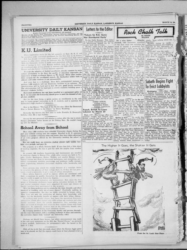 K.U. Limited -- School Away From School -- 'Tickets for K.C. Game Not Distributed Fairly' -- French, British to Leave Lebanon by March 30 -- The Higher It Goes, the Shakier It Gets -- Sabath Begins Fight to Evict Lobbyists -- Rock Chalk Talk -- New at the Library: 'The Last of the No-Hi-Cans;—How the Democrats Plan to Return Kansas to the Union,' by Harry Woodrin... -- Kentucky Has Become the First State to Make Franklin D. Roosevelt's Birthday (Jan. 30) a Legal Holiday -- Among the War Personnel Still Missing in Action After the War Is Sinanthropus Pekinensis, Better Known as the Peking Man -- With All the to-Do That Was Made About Where the Kansas-Aggie Game Was to Be Played, We Feel the Experts Could Have at L... -- For One Credit Hour, an Extension Student Attends Eight Weekly Two-Hour Class Periods, and Pays $4. -- At Present, 410 Teachers, Housewives, and Businessmen Are Enrolled in Extension Classes in Kansas City, While Other Cour... -- Typical Courses Are Those in Secretarial Techniques, Cost Accounting, Personnel Management, Statistics, Psychology and G... -- Some Persons May Attend the Classes Because of a Nostalgic Desire to Recapture the Glamour of Their College Days, Or, If... -- Many Others, However, Enroll in Courses Which Are Correlated With Their Occupations to Qualify Themselves for Advancemen... -- Some of the Class Instructors Are Businessmen. But, Since the First Group of University Professors Began Giving Extensio... -- What Do These Professors Get in Return for the Time, Thought, and Effort Involved in Teaching Such Out-of-Town Classes?... -- They Have Not Only the Satisfaction of Sharing Their Knowledge With Others, but the Invaluable Benefits of Contact With... -- So, Indirectly, Students Here at the University Benefit, Also, When Members of the Faculty Teach Extension Classes. -- By Bringing Members of the University Faculty and Persons Throughout the State Into Contact, With a Resulting Exchange O... -- Perhaps We Should Have Known, but When Announcement Was Made of the New Navy Newspaper on the Hill, the 'Fantail Forum,'...