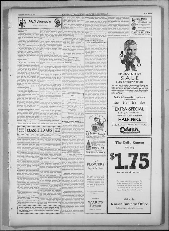 Hill Society -- Simpson Honored at Tea -- Testerman-Wentz Marriage -- Sigma Kappa Announces Election -- Three Dances in One to Celebrate Birthday of Roosevelt -- The University Club Will Give a Dinner -- Sigma Kappa Announces Election of Officers -- Dinner Guests at the Gamma Phi -- Dinner Guests at the Kappa -- Dinner Guests at the Chi Omega -- Dinner Guests at the Beta Theta Pi -- Dinner Guests at the Kappa Alpha -- Sigma House Were: Helen Finley, Ruth Martin, Frances Martin, Eunice Hults, C'37; And Maria Forbes, C'38 -- Alpha Tau Omega Announces the Pledging of Willis Luke Chapin, C'36, of Medicine Lodge, and Joe Cochrane, C'38, of Hoisin... -- Dinner Guests at the Kappa Alpha House Were: Betty Jane Campbell, C'36; Pette Lemon, C'36; Helen Moore, C'38; Marjorie H... -- Prof. Mabel A. Elliott Entertained Her Criminology Class at Tea on Her Home -- Phi Gamma Delta Announces the Pledging of Donald Metzler, C'unc, of Lawrence -- The Saturday Night Club Was Entertained Saturday Night at the Home of Prof. C. S. Skilton. Following Dinner, the Host Re... -- The K. U. Dames Met This Afternoon at the Home of F. G. Hutchinson -- The University Club Will Give a Dinner Friday Evening, Jan. 25 -- Dinner Guests at the Triangle House Were: Miss Kay Monroe, C'36; Kenneth Kern and Louis Farber, Both of Kansas City, Mo.... -- Dinner Guests at the Chi Omega House Sunday Were: Jane Case, F'37; Bob Childs, C'37; Margo Stucky, C'37; Steve DeVoore,... -- Mrs. C. W. Shaffer of Russell Was a Sunday Dinner Guest of Beta Theta Pi -- Sunday Dinner Guests at the Kappa House Were: Betty Jane Campbell, C'36; Pette Lemon, C'36; Helen Moore, C'38; Marjorie... -- Beamer Receives Six Rose Insects From California -- Contacts Only Requisite for Birth in Owl Society -- Kfu -- Burdick, Templin to Talk at Kansas Day Gatherings -- [advertisements] -- [classifieds]