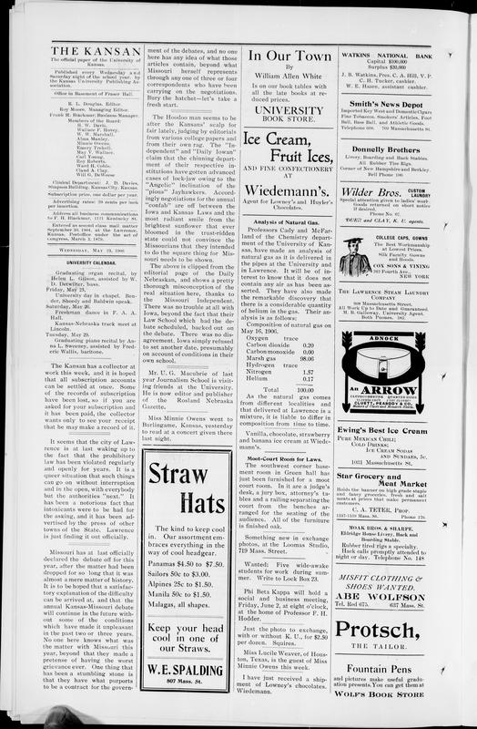 The Kansan Has a Collector at Work This Week, and It Is Hoped That All Subscription Accounts Can Be Settled at Once -- It Seems That the City of Lawrence Is at Last Waking Up to the Fact That the Prohibitory Law Has Been Violated Regularly... -- Missouri Has at Last Officially Declared the Debate Off for This Year -- Mr. U. G. Macubrie of Last Year Journalism School Is Visiting Friends at the University -- Miss Minnie Owens Went to Burlingame, Kansas, Yesterday to Read at a Concert Given There Last Night -- Moot-Court Room for Laws -- Something New in Exchange Photos, at the Loomas Studio -- Wanted: Five Wide-Awake Students for Work During Summer -- Phi Beta Kappa Will Hold a Social and Business Meeting, Friday, June 2, at Eight O'clock, at the Home of Professor F. H.... -- Just the Photo to Exchange, With or Without K. U., for $2.50 Per Dozen. Squires. -- Miss Lucile Weaver, of Houston, Texas, Is the Guest of Miss Minnie Owens This Week -- I Have Just Received a Shipment of Lowney's Chocolates. Wiedemann. -- Analysis of Natural Gas -- In Our Town -- Ice Cream, Fruit Ices, AND FINE CONFECTIONERY AT Wiedemann's -- Vanilla, Chocolate, Strawberry and Banana Ice Cream at Wiedemann's. -- Moot-Court Room for Laws -- Something New in Exchange Photos, at the Loomas Studio -- Wanted: Five Wide-Awake Students for Work During Summer -- Phi Beta Kappa Will Hold a Social and Business Meeting, Friday, June 2, at Eight O'clock, at the Home of Professor F. H.... -- Just the Photo to Exchange, With or Without K. U., for $2.50 Per Dozen. Squires. -- Miss Lucile Weaver, of Houston, Texas, Is the Guest of Miss Minnie Owens This Week -- I Have Just Received a Shipment of Lowney's Chocolates. Wiedemann. -- Analysis of Natural Gas -- In Our Town -- Ice Cream, Fruit Ices, AND FINE CONFECTIONERY AT Wiedemann's -- Vanilla, Chocolate, Strawberry and Banana Ice Cream at Wiedemann's. -- [advertisements]