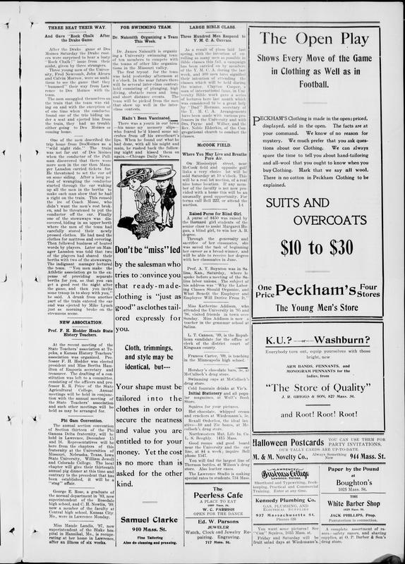 THREE BEAT THEIR WAY. And Gave 'Rock Chalk' After the Drake Game. -- For SWIMMING TEAM. Dr. Naismith Organizing a Team This Week. -- LARGE BIBLE CLASS. Three Hundred Men Respond to Y.M.C.A. Canvass. -- NEW ASSOCIATION. Prof. F. H. Hodder Heads State History Teachers. -- Phi Gam Convention. -- Raised Purse for Blind Girl. -- [advertisements] -- Prof. A. T. Boynton Was in Salina, Kan., Saturday, Where He Spoke Before a Meeting of the State Labor Unions. -- Miss Katherine Addison, Who Attended the University in '95 and '96, Visited Friends in Town Over Sunday. Miss Addison Is... -- L. T. Cannon, '09, Is the Republican Candidate for the Office of Clerk of the District Court of Kingman County. -- Frances Carter, '09, Is Teaching in the Minneapolis High School. -- Hershey's Chocolate Bars, 5c, at McCulloch's Drug Store. -- Swimming Caps at McCulloch's Drug Store. -- Cold Fountain Drinks at Vie's. Initial Stationery and All Popular Magazines, at Wolf's Book Store. -- Squires for Your Pictures. Hot Chocolate, Whipped Cream and Crackers at Wiedemann's, 5c. -- Rexall Orders, the Ideal Laxative—10 and 25c Boxes, at McCulloch's Drug Store. -- Northwestern Mut. Life Ins. Co. L. S. Beeghly, 1415 Mass. -- Good Rooms and Good Board Near the University and the Car Line, at $4 a Week; Inquire Bell Phone 1547. -- You Will Find the Largest Line of Thermos Bottles, at Wilson's Drug Store. Also Leather Cases. The Lawrence Studio Is Ma... -- George E. Rose, a Graduate of the Normal Department in '83, Now Superintendent of the Rosedale High School, and C. H. No... -- Miss Maude Landis, '97, Now Superintendent of the Blake Hospital in Hannibal, Mo., Is Recuperating at Her Home in Lawren... -- Samuel Clarke 910 Mass. St. Fine Tailoring Also Do Cleaning and Pressing. -- The Peerless Cafe a PLACE TO EAT W.C. PARRISH OPEN FOR THE DANCE -- Ed. W. Parsons JEWELER Watch, Clock and Jewelry Repairing. Engraving. 717 Mass. St. -- Kennedy Plumbing Co. GAS, PLUMBING, AND ELECTRICAL SUPPLIES 937 Massachusetts St. Phones 658 -- White Barber Shop 1025 Mass. St. JACK PHILLIPS, Prop. Pantatorium in Connection.